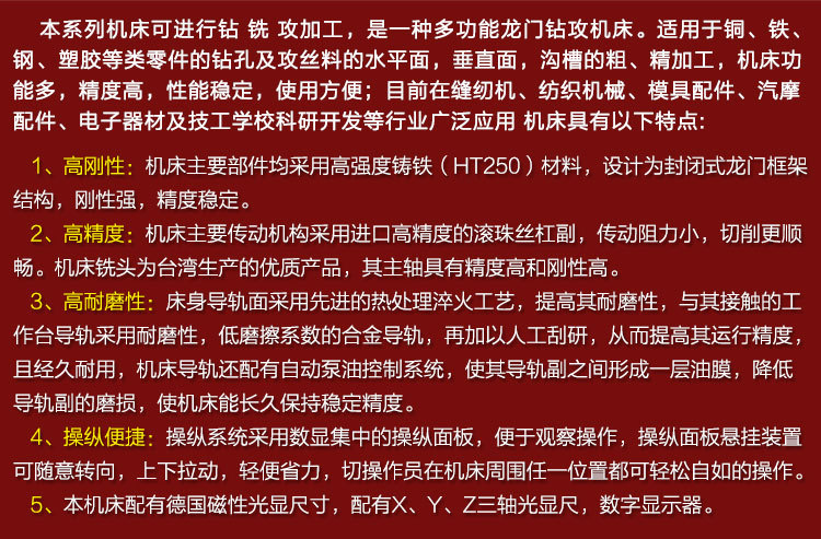 龍門數(shù)控鉆銑床系列主要用于平板、法蘭、盤類、環(huán)件等厚度在有效范圍內(nèi)工件的高效鉆孔加工??稍趩钨|(zhì)材料零件及復(fù)合材料上實(shí)現(xiàn)鉆通孔,盲孔。機(jī)床加工過程數(shù)字控制,操作十分方便。能實(shí)現(xiàn)自動(dòng)化、高精度、多品種、大批量生產(chǎn)。 本設(shè)備為高速龍門數(shù)控鉆銑床,加工效率為普通麻花鉆3-5倍,主軸內(nèi)出水,可使用內(nèi)冷刀具鉆孔。 可選配液壓卡盤,專為法蘭鉆孔設(shè)計(jì),效率快,精度高,1米以內(nèi)直徑法蘭首選。 有效加工尺寸:1米*1米。鉆孔范圍:1mm ~40mm。